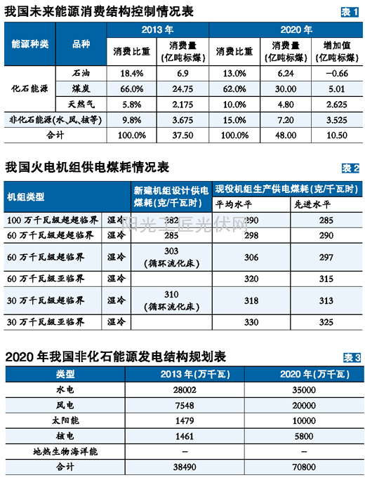 《行动计划》把“节约优先战略”列四大能源发展战略之首;把“节约”作为未来能源发展的第一个战略方针。而且,设置了能源消费总量“天花板”,即“到2020年,一次能源消费总量控制在48亿吨标准煤左右,煤炭消费总量控制在42亿吨左右”,“煤炭消费比重控制在62%以内”,成为全文的一大看点。(见表1)