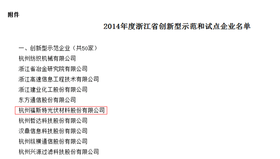 索比光伏网讯:近日,浙江省科学技术厅、浙江省发展和改革委员会发布《关于确定2014年度浙江省创新型示范和试点企业的通知》。根据《关于进一步加强创新型企业建设若干意见的通知》(浙政办发〔2010〕108号)和《浙江省创新型企业评价制度》的要求,福斯特作为试点期满的创新型试点企业接受了评估和审核,并成功荣获2014年度浙江省创新型示范企业。