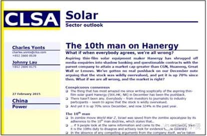 仅仅3个月后,2015年2月27日,杨立志又发表了一篇名为《汉能的第10个观察者》的分析报告。一反此前对汉能的质疑,称投资者仍然可能严重低估了汉能的成长潜力。