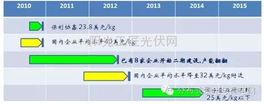 然而光伏制造业戴高污染、高能耗的“双高”帽子艰难前行,经过几年的艰苦努力,不断地进行节能工艺的改进,持续降低成本,2013年国内多晶硅综合能耗水平已从2009年的200-300kwh/kg下降到130-150kwh/kg,还原电耗也从120kwh/kg下降至60kwh/kg,下降幅度达50%以上,其中先进企业的综合电耗已降至70kwh/kg以下,还原电耗已下降至45kwh/kg以下。