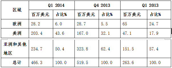 第四季度,阿特斯全球各区域市场销售收入占公司总销售额比重分别为:美洲61.8%,亚洲和其他地区32.7%,欧洲5.5%。2014年第三季度占比为:美洲71.7%,亚洲和其他地区20.9%,欧洲7.4%。2013年第四季度,美洲32.1%,亚洲和其他地区62.4%,欧洲5.5%(下表):