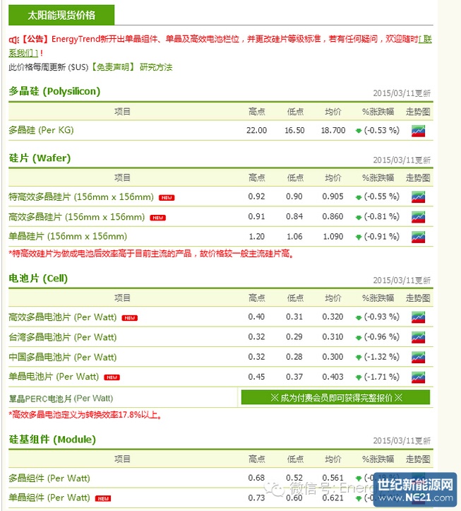 电池部份,高效多晶电池片价格则跌0.93%,现货均价为$0.32/w,