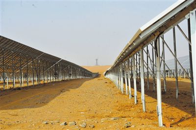 索比光伏网讯:中卫市靠近沙漠,属半干旱气候。仅2014年中卫市年日照时间近3000小时,平均每天8小时,为了充分利用这一优势,该市于2012年开工建设沙漠光伏产业园。今天,这座崭新的产业园已经竖起一排排太阳能发电板,形成一片“光的世界”。