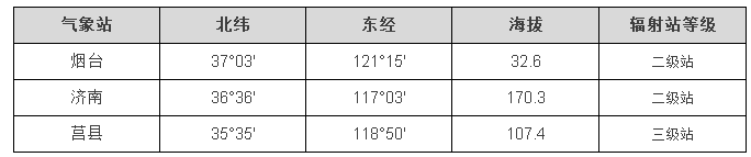 山东省共有3个太阳能辐射观测站,它们的主要信息如下表所示。
