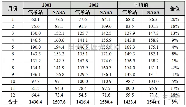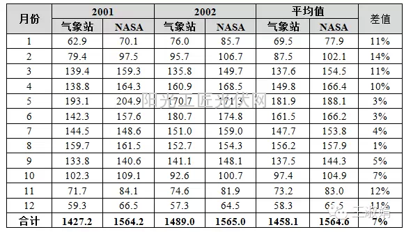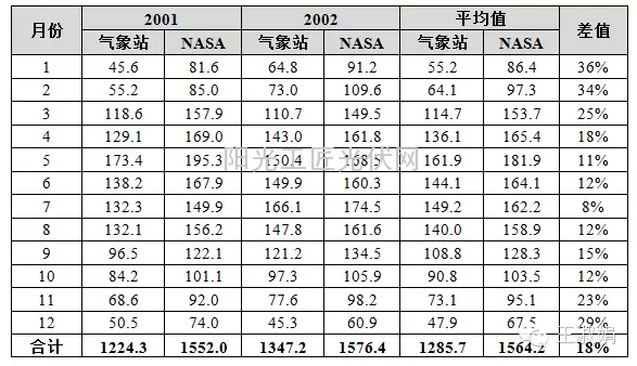 收集了3个观测站2001年和2002年的辐射量数据,与NASA同期数据进行对比,如下表。