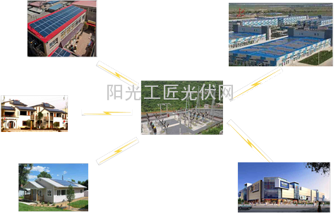 20-50个居民建筑物构建的分布式光伏电站汇流至一个电网群落升压站,组成一个独立电网向就近的工业或商业供电,示意图如图1::