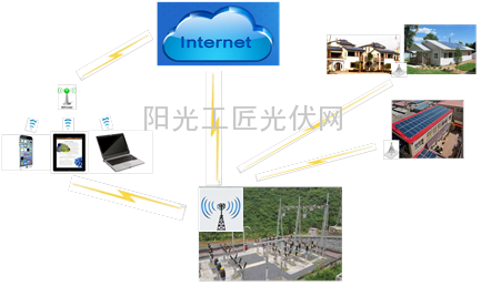 分布式电网群落采用集中监控的管理模式,通过建立局域性无线基站对各分布式电站进行监控。在中控室附近设置中央通讯基站,在分布式电站光伏区和设备区设置若干个子基站以加强信号接收和传递,监测信号和控制信号通过无线通讯技术进行传输,中控室接受到信号后通过互联网将实时数据自动上传到云储存,运维人员可在任何有无线网络的地方通过手机客户端(专业版)或使用基于互联网Web的软件调用云储存信息对电站进行监视和控制。为居民分布式电站股东开放手机APP客户端(客户版),使股东对电站实现实施监管与盈利透明化,示意图如图2: