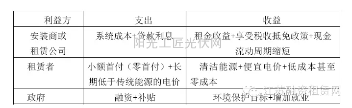 根据表一可以看出,对于租赁公司而言,可愿意通过贷款等融资手段购买光伏发电系统,然后进行安装、维护以满足租赁方的电力需求,收取租金并享受税收抵免政策,还缩短了现金的流动周期,避免了目前大多光伏发电企业普遍面临的现金流转问题,也同时获得了一定的收益。而在政府方面,对太阳能租赁产品供应商或使用者提供税收抵免等优惠政策,并为企业提供融资支持,将促进该国发展太阳能经济,实现可再生能源计划目标,并一定程度上增加就业人口。