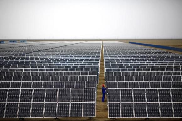 图为中国敦煌一处光伏发电厂,一名工人在检查光伏组件。(摄影记者:REUTERS/CARLOSBARRIA)