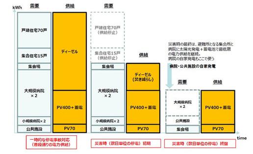 发布称,当电网断电时,可利用光伏发电和蓄电池稳定供电,组合使用生物柴油发电机,可保证三天内正常水平的供电。当大地震等导致长期停电时,也可以为医院和集会场所等持续供给最低限度的电力。能够维持向灾害活动基地设施的供电,可提高当地的灾害应对能力和防灾能力。