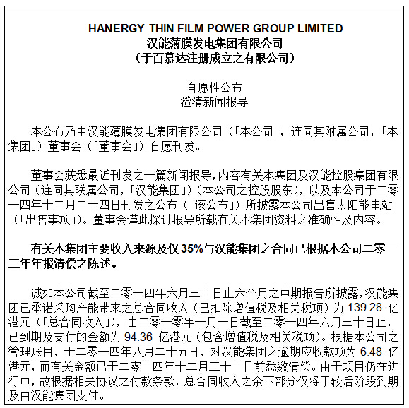 在汉能薄膜发电于2015年1月30日发出的“澄清新闻报导”公告中,已对相关问题作出澄清报导,内容如下: