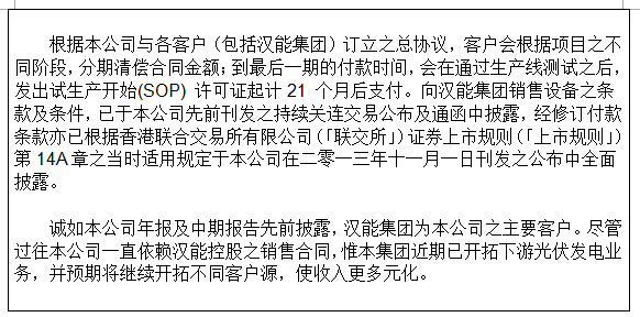 除此之外,根据在汉能薄膜发电于2015年2月27日发出的“600MWBIPV生产线设备销售合同及根据一般授权订立认购协议”公告,于2015年2月26日,汉能薄膜发电之间接全资子公司福建铂阳,与山东新华联新能源科技有限公司订立销售合同及服务合同;据此,福建铂阳同意出售及设备购买方同意购买用于建筑光伏一体化(BIPV)业务之若干生产线设备,总产能为600MW,总价格为1.98亿美元;并对此生产线设备提供技术服务,总服务费用为4.62亿美元。设备购买方就销售合同及服务合同应付之总代价,加起来将为6.60亿美元。是次与第三方设备购买方订立销售合同和服务合同,将可为汉能薄膜发电带来可观的第三方客户收入,减低关联交易占总收入的比例。