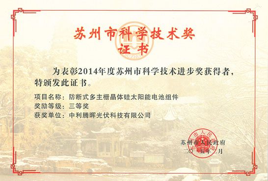 索比光伏网讯:近日,苏州市政府、常熟市政府分别颁布了2014年度科学技术奖获奖名单。中利腾晖光伏科技有限公司的“防断式多主栅晶体硅太阳能电池组件”同时获得苏州市科技进步奖三等奖和常熟市科技进步奖二等奖。该技术成果由中利腾晖独立自主研发,拥有完全的自主知识产权,同时该设计方案和外观已经被国内外同行广泛认可和借鉴。两个奖项的获得充分展示了中利腾晖日益增强的科研实力与创新能力,同时也是公司多年来对研发的高度重视及投入的肯定。