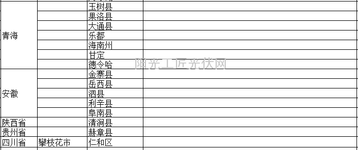 叙永县、古蔺县、朝天区、旺苍县、苍溪县、马边县、嘉陵区、南部县、仪陇县、阆中市、屏山县、广安区、宣汉县、万源市、通江县、南江县、平昌县、小金县、黑水县、壤塘县、甘孜县、德格县、石渠县、色达县、理塘县、木里县、盐源县、普格县、布拖县、金阳县、昭觉县、喜德县、越西县、甘洛县、美姑县、雷波县
