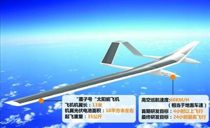 此次自主研发的“墨子号”太阳能飞机,主要是依靠10平方米左右的机翼面积,覆上光伏电池组件,每平方米面积可提供约100瓦功率。它微动力、轻机身,不仅环保而且节能,在6000米高空的巡航速度只有每小时60公里,相当于地面车速。但这个飞行高度零下20多摄氏度的低温,对于电池薄板与高密度聚合物锂电池是一大挑战,目前由航天系统从事空间电源研究的811所负责研制。