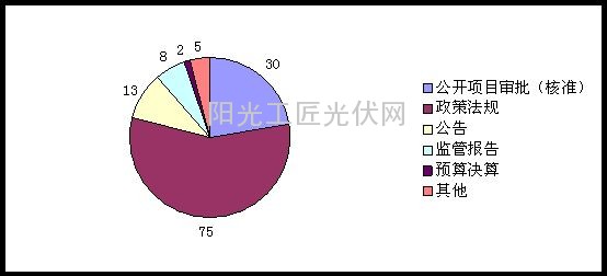 一是主动公开信息133篇。公开项目审批(核准)类信息30篇,关于进一步落实分布式光伏发电有关政策的通知、国家能源局关于调控煤炭总量优化产业布局的指导意见、关于开展新建电源项目投资开发秩序专项监管工作的通知、关于印发全国海上风电开发建设方案(2014-2016)的通知等政策法规类信息75篇;国家能源局公告13篇;监管报告8篇;2014年部门预算以及2013年部门决算信息2篇;其他信息5篇。