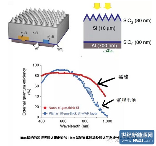 黑硅电池,顾名思义,就是颜色比常规的蓝色晶硅电池要深很多,呈黑色。其核心是通过刻蚀技术,一方面在常规硅片表面制绒的基础上,形成nm级的小绒面,纳米锥型的小绒面长径分别为400和450nm,长径比为0.9,从而加大陷光的效果,降低反射率,增加对光的吸收(这就是看上去黑色的原因);另一方面,通过二次刻蚀来降低表面复合,从而将常规电池的转换效率绝对值提高0.5~0.6%。