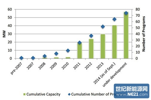 社区太阳能系统的累计设置数量(蓝点)和累计装机容量(绿线)(出处:NREL)索比光伏网 https://news.solarbe.com/201503/31/197608.html