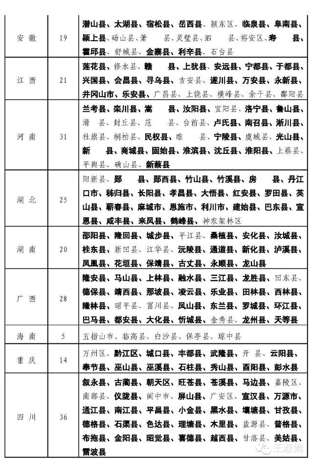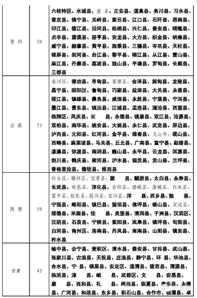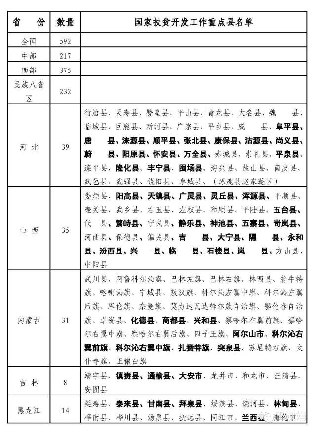 注:黑体字加粗为集中连片特殊困难地区范围内的国家扶贫开发工作重点县