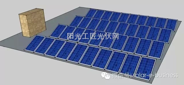 所示,每行方阵为10片组件,两行共20片组件为一串,共两串,以最佳行间距2.81米排布,逆变器为组串式逆变器,有两个MPPT,为突出阴影这个影响因素,在方阵左侧距离约1.76米处增加一睹高墙,长度4米,墙的最高点和组件边框的最低点距离约3米左右,当冬至日太阳高度角较低时,第一串的第二排和第二串的两排都将受到前排组件的阴影遮挡,具体遮挡的面积将随着太阳方位的变化而变化。