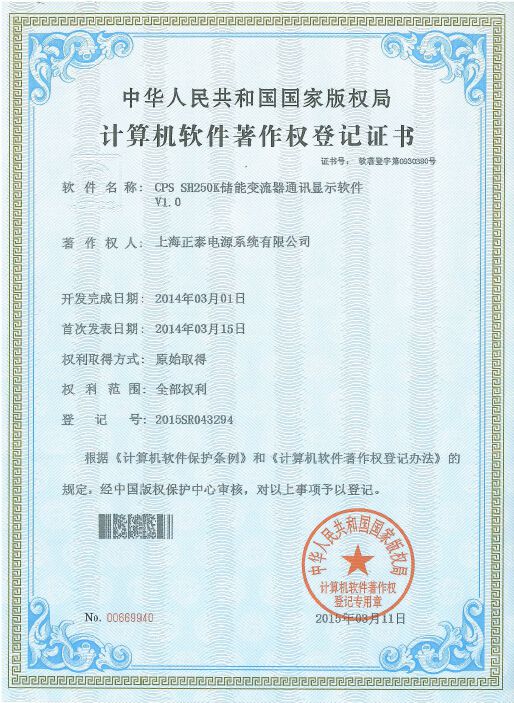 索比光伏网讯:近日,正泰电源系统自行编写的软件:《CPS SH250K储能变流器通讯显示软件V1.0》再一次获得由国家版权局颁发的计算机软件著作权登记证书。