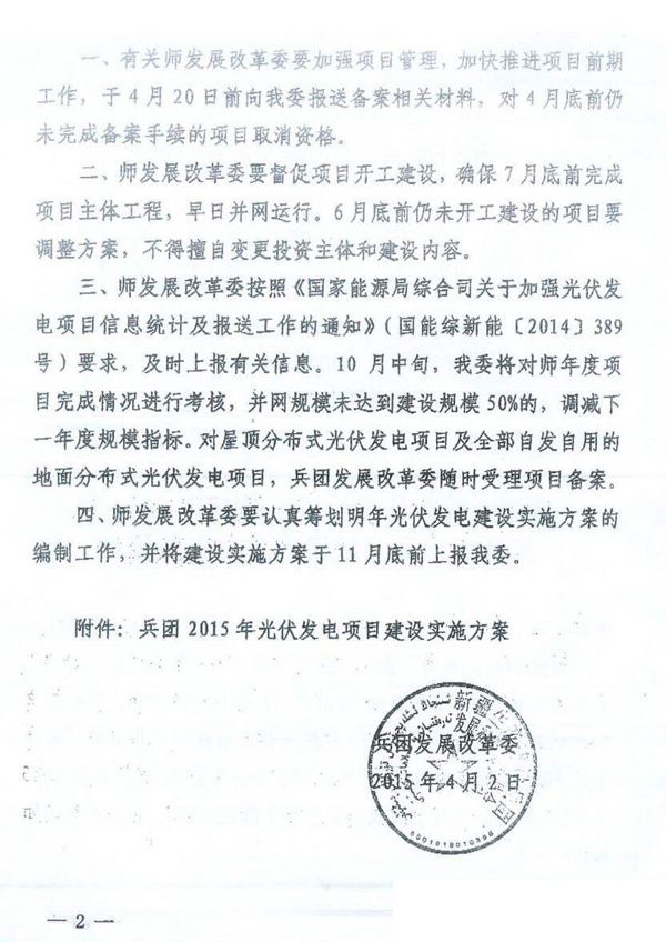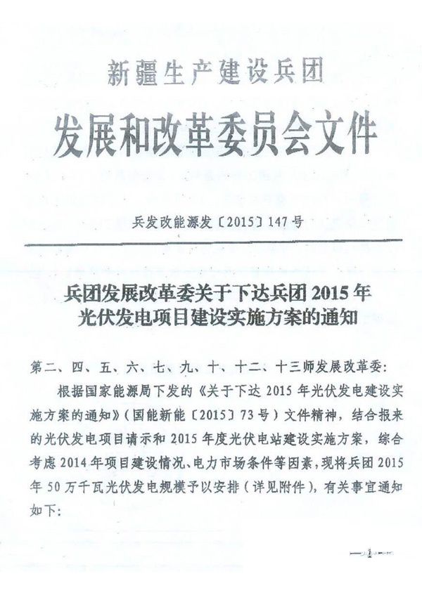 文件指出:结合来报发电项目请示和2015年度光伏电站建设实施方案,综合2014年项目建设情况、电力市场等因素,对2015年新疆兵团50万千瓦光伏发电规模予以安排。