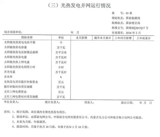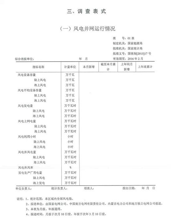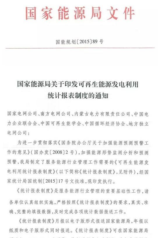 为进一步贯彻落实《国务院办公厅关于加强能源预测预警工作的意见》,加强能源形势的分析和预测预警,国家能源局制定了服务能源业管理工作需要的《可再生能源发电利用统计报表制度》,经国家统计局国统制【2015】17号文批准,现印发执行。