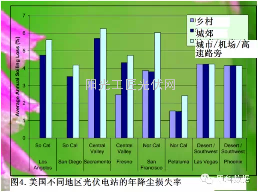 图4 为美国不同地区光伏电站的年降尘损失率,而且细分了乡村,城郊和城市/机场/高速路旁三个小区,而大部分城市的城市降尘损失率要高于其它两个地区。而最右边的两个地区属于沙漠气候,三者的差别不大,年损失率都在4%左右。而实际上大型光伏电站的降尘损失率要比上面四幅图里的值要高,因为这是数值都是在试验站测得的,而且都是安装在楼顶上,而降尘量是随着地面高度呈递减趋势的,所以如果电池板是安装在地面,则降尘损失率更大。而我国西部地区又是亚洲沙尘暴的发源地,降尘比上图地区的都高,且我国的大型电站都安装在戈壁摊或者沙漠上,植被较少,所以降尘损失率保守估计在5%以上。而一个十兆瓦的光伏电站25年的降尘总损失约为:1.3度/年/瓦*10兆瓦(电站规模)*25年(工作年限)*0.9元/度(上网电价)*5%(降尘损失的效率)=14625000元,约为1462万元。这个数值还是很大的。所以建议光伏电站的管理人员能提高对降尘损失率的重视程度,并做好定期的清洗工作。