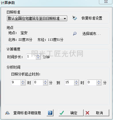 然后再点击常用分析,按步骤设置参数,可设置的参数有:日照标准,一般来说仅分析冬至日一天的阴影虽然不太全面,但对于工程来说已经基本足够了;地点,一定要选择正确,这个软件有个好处就是可选择的地点详细到了深圳的一 个区;计算精度,默认的是 1 分钟;分析时间也是默认的值。