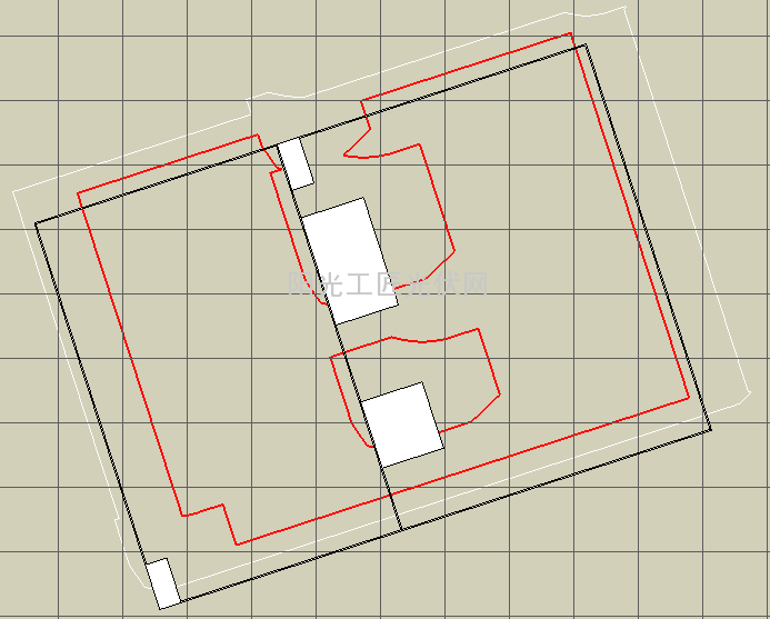 点击确定,然后再选择遮挡物。就出现下面这个图,红色线以内就是冬至日上午 9 点到下午 15 点的阴影范围了。从这个图我们可以知道,这个软件的阴影 分析还有待改进,它在分析阴影时,只分析了遮挡物顶部的阴影,没有分析墙的 阴影。
