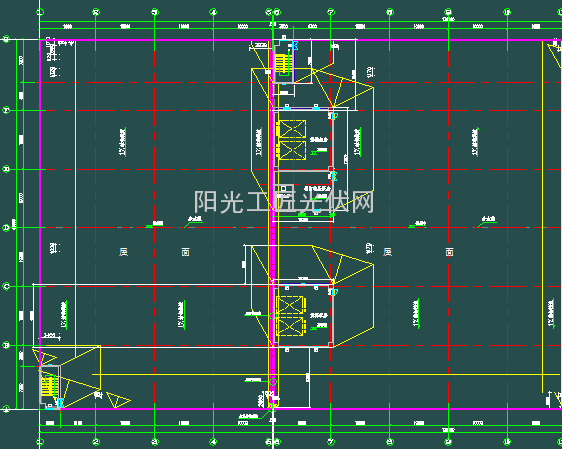 如上图所示,这是一个屋顶光伏电站的组件布置图,布置图要说明组件的安装位置和阵列间距,布置图的设计关键是阴影分析。在项目设计时我们首先要通 过施工图了解上面的情况,从上图可以知道:原有屋顶非常平整,屋面方位角是 南偏东 18 度,在上图的黄色圈内是建筑的楼梯间和电梯室,高度为 3 米,屋顶 四周都有 1.2 米高的女儿墙。为了使光伏电站的建设符合设计规范,必须使光伏 组件在全年任何一天的早上 9 点到下午 15 点时间内不得有阴影遮挡。为此我们 对女儿墙、楼梯间和电梯室时行阴影分析,以确定屋顶的光伏组件可安排范围。