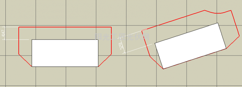 我还将 sunlight 软件计算的阴影长度与以前使用的计算公式计算结果对比, 在阵列为正南朝向时,计算结果基本一致,sunlight 软件的计算结果稍微大了一 点。以下我对阵列的方位对阵列间距的影响进行分析,画了以下两个图,左右两 边的两个建筑模型完全相同,只是方位不同,左边建筑是正南的,右边的是南偏 东 18 度。用 sunlight 软件分析得出的间距分别是:4147mm 和 5291mm,相差了24%。可见在阵列的方位不是正南时,使用现有的公式得到的结果明显偏小。