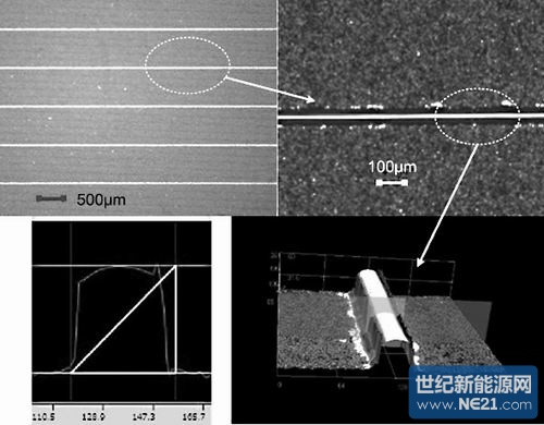 “十二五”期间,在国家“863”计划及中科院重点实验室开放课题支持下,沈阳自动化所课题组深入研究微滴喷射机制,开展国产纳米银浆料物性与喷印工艺适配性研究,自主研发出工程化高速、高精度喷印控制及大阵列喷头联动控制技术。通过优化喷射速率、喷印分辨率、固化条件等制造工艺,实现正表面金属栅极宽度<40μm,高宽比>0.6,三维形貌均匀的太阳电池超细栅电极喷印核心工艺,设计开发出国内首台喷墨打印样机系统,为开展光伏装备50MW中试线研发及产业化工作,形成高效低成本超细栅电池生产线解决方案奠定基础。