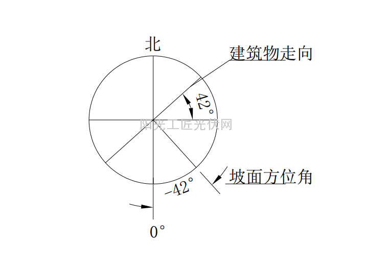 该项目地点位于X地。项目建筑物为人字形坡屋顶居民住宅,建筑主体走向为东偏北42°,建筑物坡面倾角(坡度)为25°左右。若以正南方向为方位角0°,顺时针方向为正方向,则该项目建筑朝南坡面的方位角为-42°。如下图所示: