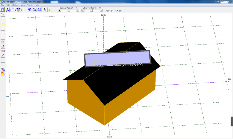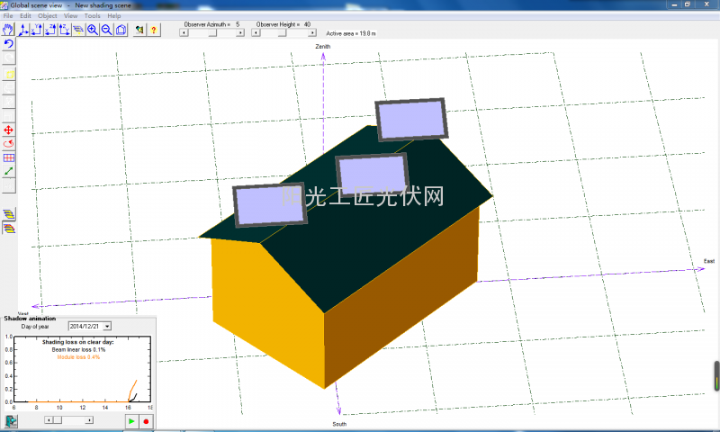 3KWp电站直接装于建筑物南坡即以25°倾角、-42°方位角安装,方阵安装模型、接受辐照量及发电量情况: