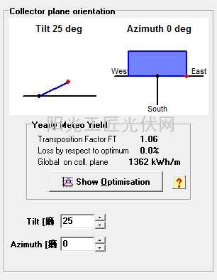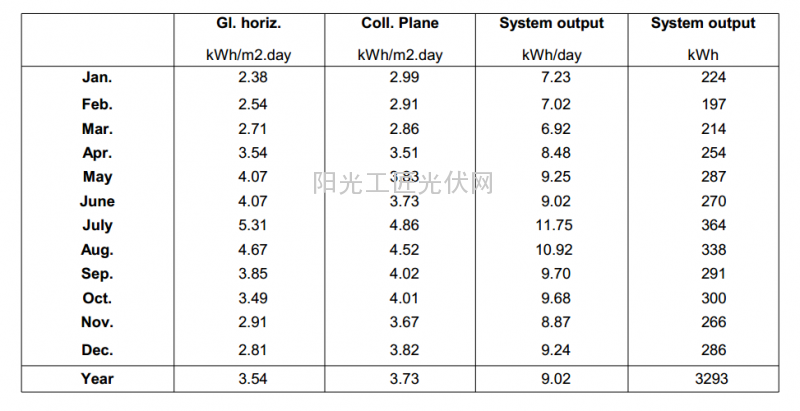 由上面两份图表看出当3KWp电站以25°倾角面向正南方向安装时,其电池板表面接收的辐照量与水平面接收的辐照量之比FT为1.06,年发电量为3293KWh。