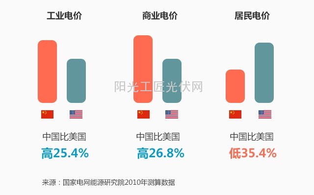 我国电价主要分工业电价、商业电价、居民电价三大类,其中工商业电价占近8成,电价结构相对于美国,如下图所示: