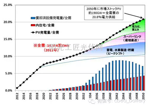 JPEA预计,到2030年日本的光伏装机量将达到100GW,届时,光伏发电在总电力需求中所占的比例将达到11%左右。据称,这个比例超过10%以上,就需要与储电、储热等储能技术,以及利用热泵热水器和纯电动汽车(EV)等的“负载能动化”相结合。分析人士认为,这将有望催生储能新业务,以及符合当地特性的多样化能源系统等。