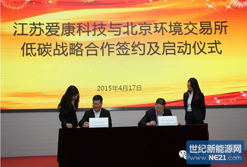 会上,环交所为爱康科技在2015年春节提出的“爱康新年爱心低碳活动”提供了碳中和服务,为爱康科技颁发了碳中和证书。2015年春节爱康科技通过微信平台在移动互联网上发起了“爱康碳中和年”活动,以更好推动碳市场的发展,普及碳排放及碳中和概念。本次碳中和签约仪式上,爱康通过付费方式,通过北京环境交易所购买3656吨CCER碳额度,用于中和春节烟花爆竹燃放所产生的二氧化碳排放,从而实现减排的目的。爱康科技所购买的CCER由环境交易所于签约仪式后完成注销,实现碳中和。