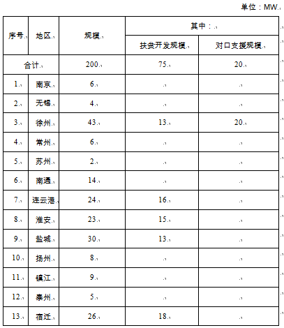 四、积极稳妥开展光伏扶贫。去年,国家设立“扶贫日”,今年,省人大常委会审议通过《江苏省农村扶贫开发条例》。根据国家和省扶贫工作要求,今年在重点扶贫开发县、六大片区所涉及的县(区)尝试开展光伏扶贫工作(规模安排见附件1)。在下达各市的年度规模中,请有关市优先安排每个重点扶贫开发县5MW规模、每个片区内的县区(重点扶贫县以外)3MW规模。项目建设地点首选经济薄弱村,如果经济薄弱村无法选址,经商当地县(区)扶贫办同意,可以在本县(区)范围内选址。开发企业应与当地经济薄弱村签订用工合同、租地合同、经营收益分成合同,并报当地发展改革委、扶贫办。鼓励有关部门采用扶贫资金入股的方式参与光伏扶贫项目建设。
