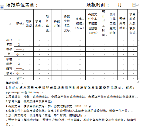 五、抓紧编报年度实施方案。各市要在规模指标下达后10日内,完成光伏电站项目备案,备案文件抄送省财政厅、物价局、能源局,作为申请国家补贴资金和省级电价补贴资金的依据。4月底前报送本市2015年光伏发电建设实施方案表(附件3),按照2015年新增项目、以往年度结转项目分类填报。其中,2015年新增项目是指纳入本年度规模的集中式光伏电站和地面全额上网、余额上网分布式光伏电站项目,包括2015年新增备案项目和2015年1月1日前已经核准或备案但今年开工的项目。2015年新增项目总规模不得超过下达的新增建设规模。以往年度结转项目是指2015年1月1日前已核准或备案、且已开工的光伏电站项目,须附送项目核准或备案文件、组件和逆变器供货合同、开工照片等相关材料。本年度规模指标不足的,可按附件4另附报送,作为调剂备选项目。
