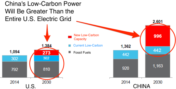 根据彭博社新能源财经(以下简称BNEF)的调查显示,中国对可再生新能源的重视在近几年快速提升,仅2015年一年,中国就计划建造15~18GW太阳能发电项目,而这一数字足足是美国的2倍。对于未来15年,中国预计打造一张远甚于美国电网规模的低碳电力网,“你可以试想一下到2030年中国的电网规模将是一个怎样的场景”,BNEF创始人Michael Liebreich在上周年度峰会上如是称,“它将是中国未来极具竞争力的优势”。