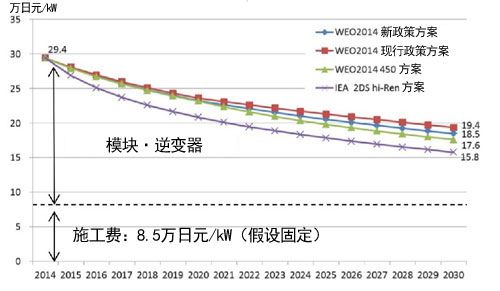 经济产业省根据IEA的四个方案估算的结果是:太阳能电池板和光伏逆变器(PCS)等的费用将趋同于国际水平;若假设施工费为8.5万日元/kW,则到2030年,住宅用光伏发电设备的导入成本将降到16.6~22.0万日元/kW,非住宅用途将降至15.8~19.4万日元/kW。住宅和非住宅用途的导入成本到2030年都将大幅降到目前的一半或三分之二。