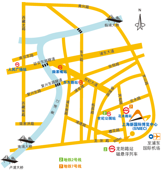 注:地铁7号线花木路站靠近新国际博览中心2号入口厅,地铁2号线龙阳路站靠近新国际博览中心1号入口厅。大会组委会将为参会人员提供龙阳路地铁站至展馆的免费巴士接送服务。
