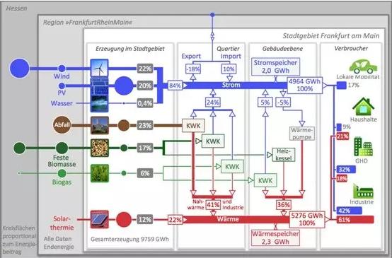 下图为研究院给出的具体图解,其中左边蓝色标识代表能源来源为风能、水力和太阳能,棕色代表废料发电,绿色则代表生物质能和沼气发电。产生出的电能可分别供交通、住户和商业楼宇以及工业使用。从图表中还可以看出,城市能源(主要是分布式光伏)足以支撑30%供电需求以及31%的供热需求。此外,法兰克福周边地区如莱茵-美因地区(50%)以及黑森地区(11.6%)可再生能源也将成为法兰克福供电的主要来源。