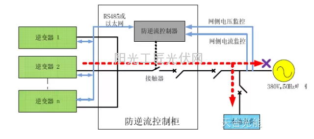 上文主要介绍了非智能式防逆流控制的基本原理,虽然比较简单,对于日用电非均衡负载,很难协调太阳电池组件发电量与负载需求间的匹配关系,很难满足光伏给负载供电的连续性,而对于日用电均衡负载,例如某工厂由于使用制冷电器和电暖设备,夏冬季的负载电量需求多于春秋季,如果系统容量按照满足夏冬季的用电设计,在春秋季势必会产生多余的电量,被防逆流控制完全切断逆变器的输出,会导致光伏发电量大大浪费,因此对非智能式防逆流控制还需要做些改进,目前的一般做法是使用智能式控制方法,通过与逆变器进行RS485通讯,降低逆变器的功率输出,并和负载进行匹配。