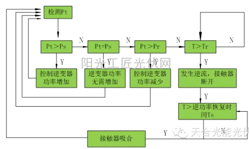 当网侧功率Pt大于Ps时,控制接触器吸合,并给逆变器发送通讯命令,控制逆变器功率逐渐增加。当网侧功率Pt小于设置的控制功率Ps但大于设置的Pr时,控制器给逆变器发通讯命令,控制逆变器功率逐渐减小,直到Pt= Ps;当Pt<Pr时,且逆功率的时间超过Tr,控制器发出命令,断开接触器,逆变器与电网的连接断开[1]。