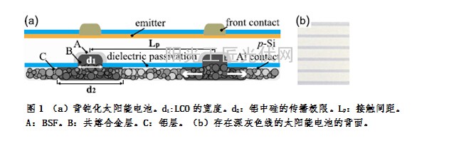 面结构--接触开缝的宽度(LCO),d1;铝层中扩散硅的最大传播极限,d2;接触面积,LP,所以,(d2-d1)/2代表了在LCO的一侧(远离接触面积)的铝中的硅的传播。如图所示,在图1(a)的截面模型中,LCO,d1限制了硅和铝的接触面积,电池背面全部覆盖着铝,LCO在结构的背面,而BSF在LCO中形成,这是铝硅的相互扩散。图1(b)的显微镜图片所示的是和图1(a)相同背面结构的太阳能电池背面的一部分,深灰色部分(在d2里)在铝层中是显而易见的,但不代表BSF的形成,因为它们比LCD(d2>d1)要宽,理解这种现象可以促进现在研究的发展。