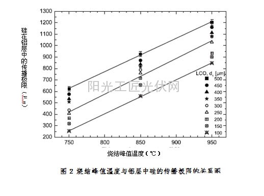 铝层可以用扫面电子显微镜(SEM)和能量色散谱/能量色散x射线来表征(EDS/EDX)。如图1(a)所示,三层(A,B,C)分别是:BSF(A:硅和1%的铝合成);共晶层或铝硅合金(B:铝和12.6%的硅合成);和多孔铝C。对于背钝化太阳能电池,可以从两方面重新定义铝层:(1)在共晶合金(大于铝和12.6%的硅的合成)中的深灰色可见区域(在d2范围内);(2)铝层的剩余部分是有铝粉浆的固体颗粒形成的。图2所示的是不同LCO宽度的d1关系图,其中y轴是深灰色区域(硅在铝中的区间限制d2)的光学测量,对应着烧结的峰值温度,LCO是500μm时,标绘的误差线表示了在光学显微镜分析中的较小偏差。对不3个不同的d1值,图线为线性拟合,而相同的关于烧结峰值温度的线性相关是值得人们注意的,其中斜率是(3±0.12)μm/℃,这意味着LCO的增长速度是(1.50±0.06)μm/℃。此外,LCO边界处硅的横向扩散限制[d2-d1]/2决定于以下参数:750℃时是(75±9),850℃时是(225±30),950℃时是(375±90)。这些结果显示对于一定的烧结峰值温度,硅在铝中的扩散范围是不变的,而且不受LCO宽度的影响,所以硅在铝中的最大的扩散范围是可以预测的。