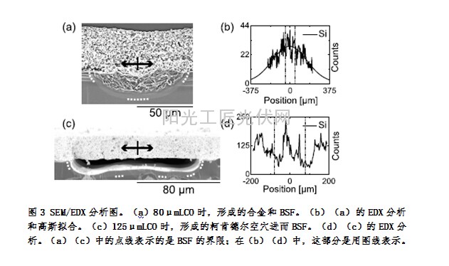 硅-铝层的形成从铝的熔化开始。液体铝浸润电介质的开缝的硅表面,然后硅在铝层中溶解,硅中铝渗透的深度是关于温度和铝球直径的函数。在烧结峰值温度为950℃时,渗透深度是20μm,如图3(a)和图3(c)所示。因为硅在铝中的溶解度比铝在硅中的溶解度要高,所以硅原子在铝中扩散的体积比铝原子在硅中的大。如果烧结峰值温度太高,扩散会加快,而且硅在铝层中扩散的会更深。界面处,首先铝直接和大部分硅接触,并处于饱和状态,然后硅扩散过程从大量的液体铝质量的横向界面的边界(没有饱和的硅)开始,几秒过后,在距离接触面大于370μm的铝层中可以发现大量的硅原子。P型硅(BSF)在渗透时大量铝原子的出现直接变换了邻近表面,一旦烧结峰值温度达到最大值,液体溶解就会达到饱和。